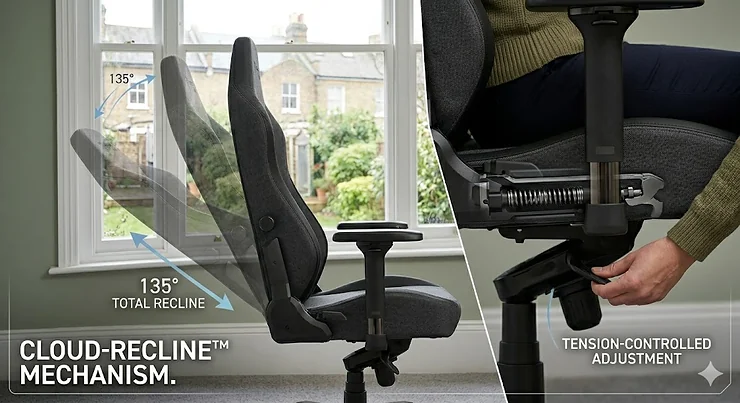 The revolutionary aspect here is the lumbar mechanism. Traditional gaming chairs give you a knob to push support forward—the Iskur V2 NewGen’s system rotates, tilts, and adjusts vertically whilst maintaining consistent pressure against your spine. During movement between sitting positions (leaning forward for intense work, reclining for casual browsing), the support follows your back’s curvature automatically. It’s engineering typically found in £800+ executive chairs, implemented in a package that doesn’t look absurdly corporate during video calls.